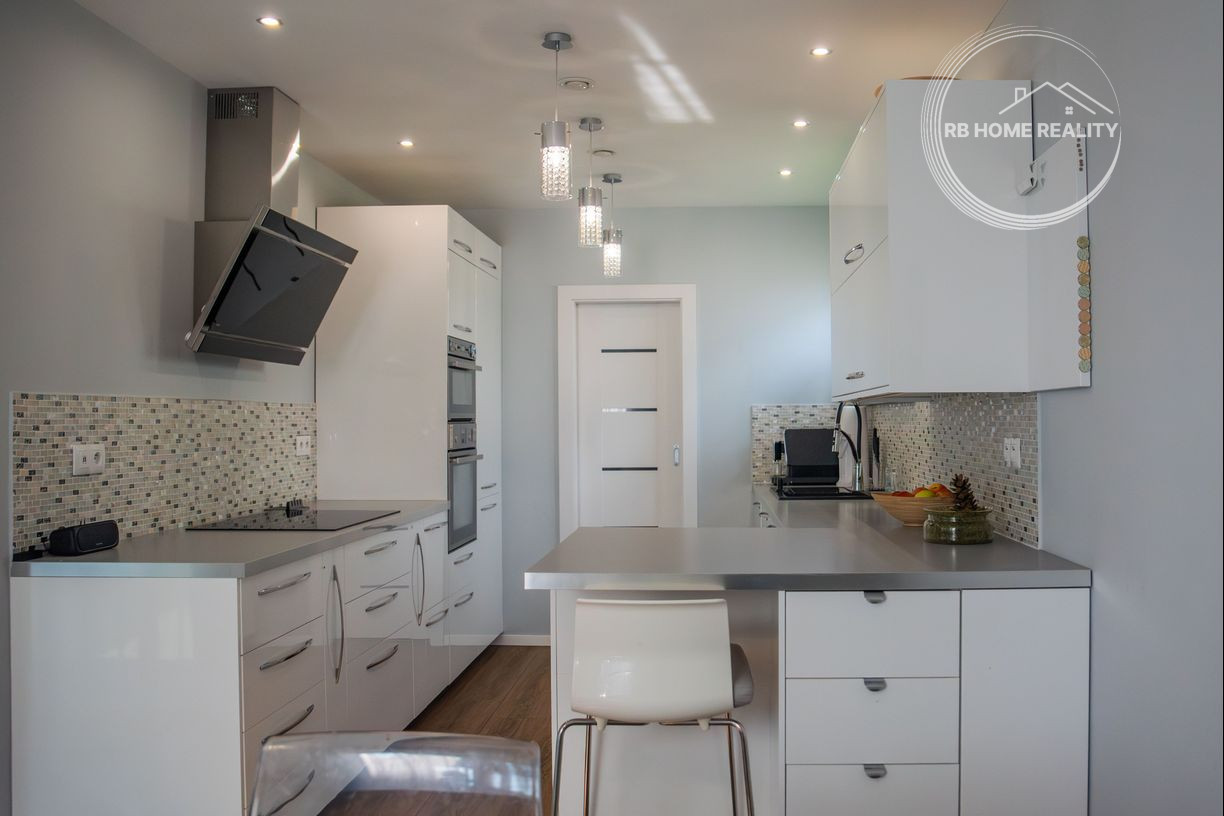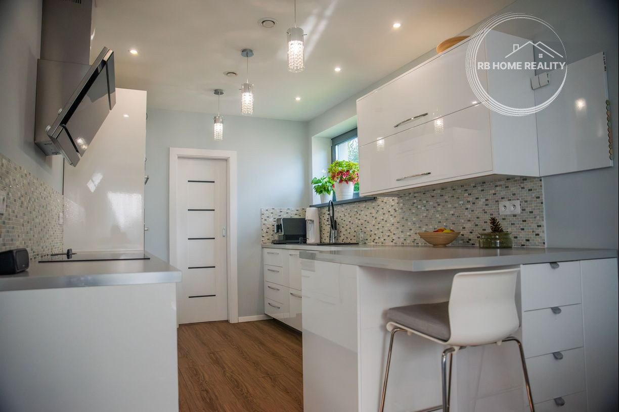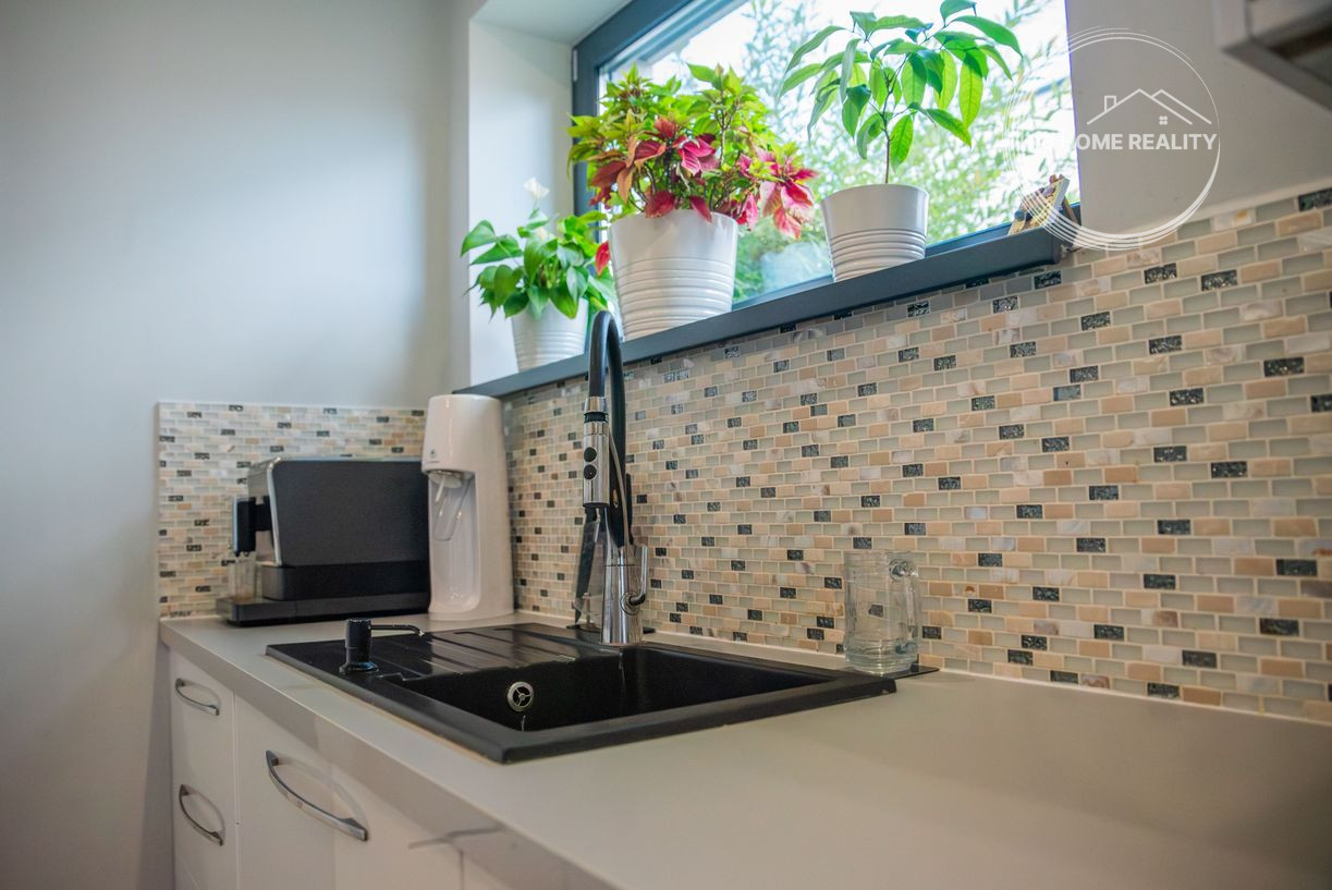 • kuchynská linka so vstavanými spotrebičmi (umývačka riadu, rúra, indukčná varná doska, digestor, chladnička z mrazničkou, drez, batéria)