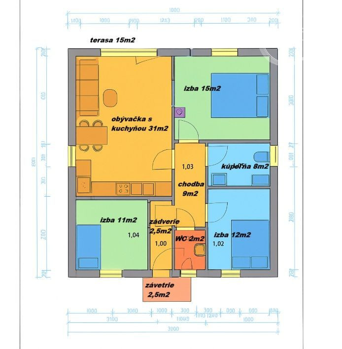 • obývacia izba s kuchyňou (31m²) s výstupom na terasu